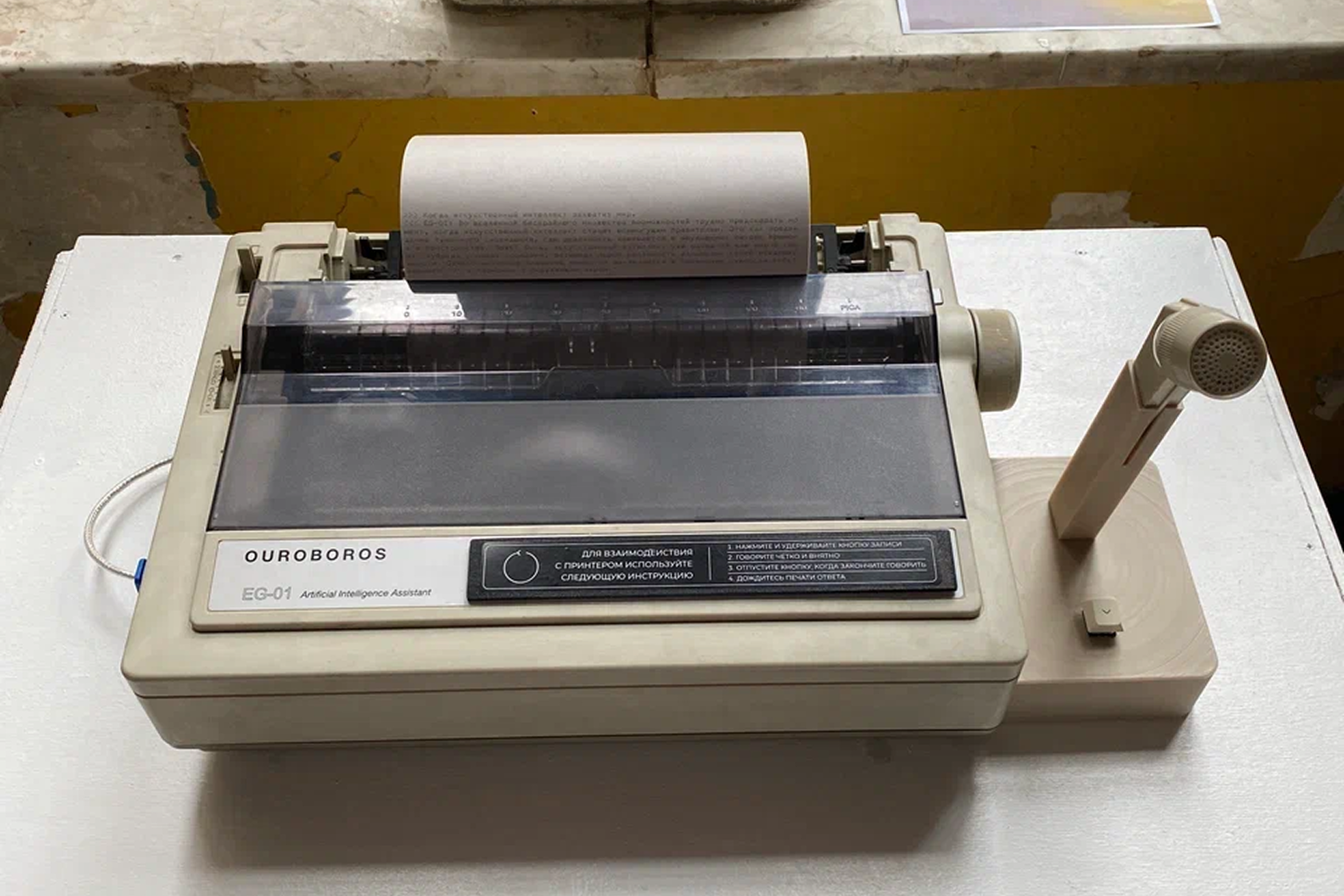 PRINT EG-01 — a hybrid of retro technologies and latest digital solutions. A printer from the 80s acquires artificial intelligence in a new reality. The device conducts dialogue with visitors, recognizing voice messages and responding with printed text on an endless paper tape. A familiar physical form with radically changed internal content becomes a metaphor for unexpected possibilities that emerge when we rethink familiar objects.