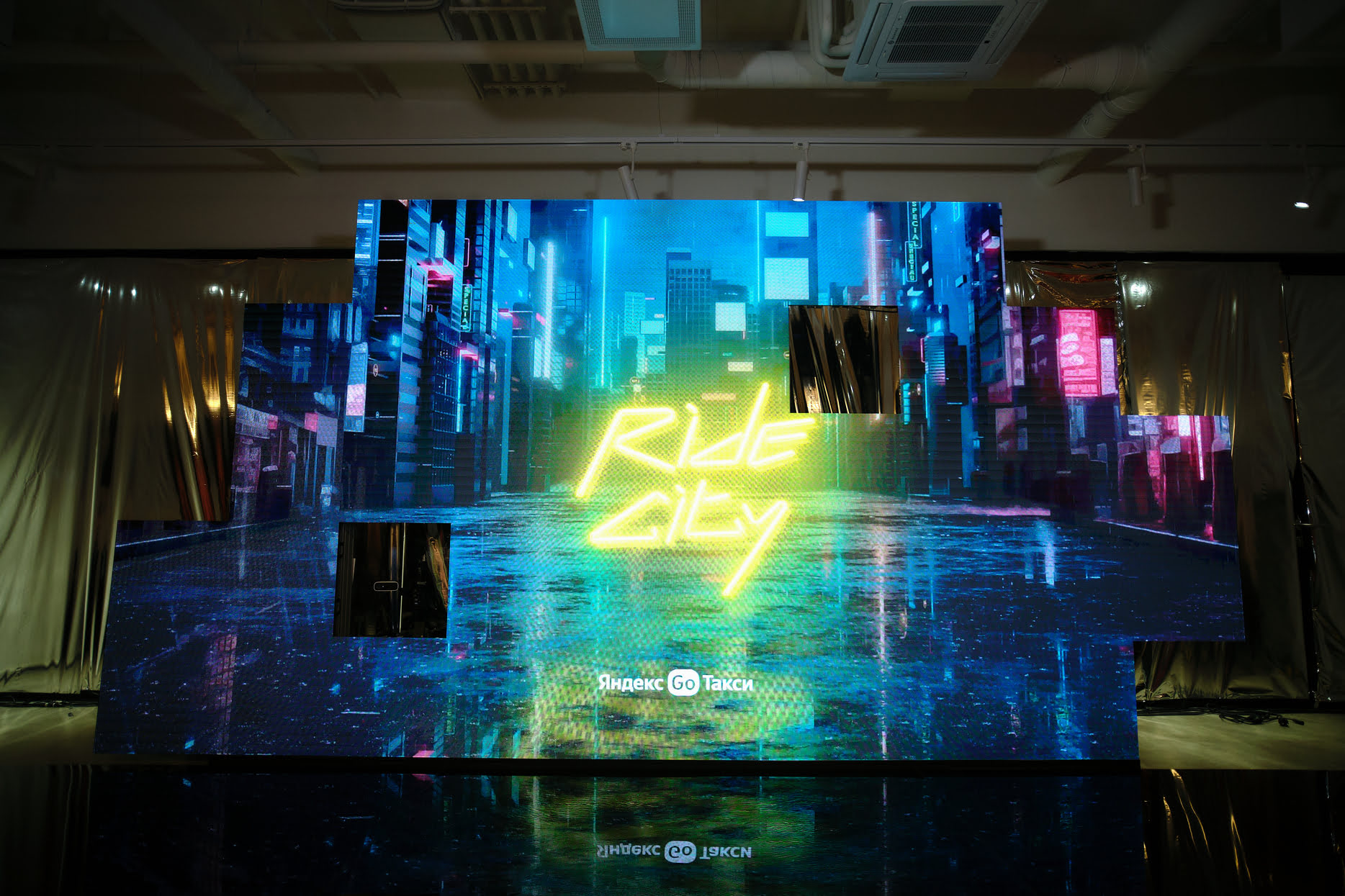 A cyberpunk installation of fragmented screen modules modeling a dystopian future. Disparate screens create a unified space where the real world collides with the digital. Visitor movements are captured by the system and transformed into a silhouette on screens that adapts to the environment and constantly mutates under the influence of deliberate visual distortions. Glitches and interference become not just visual techniques but part of the interaction, affecting how a person's digital twin transforms.