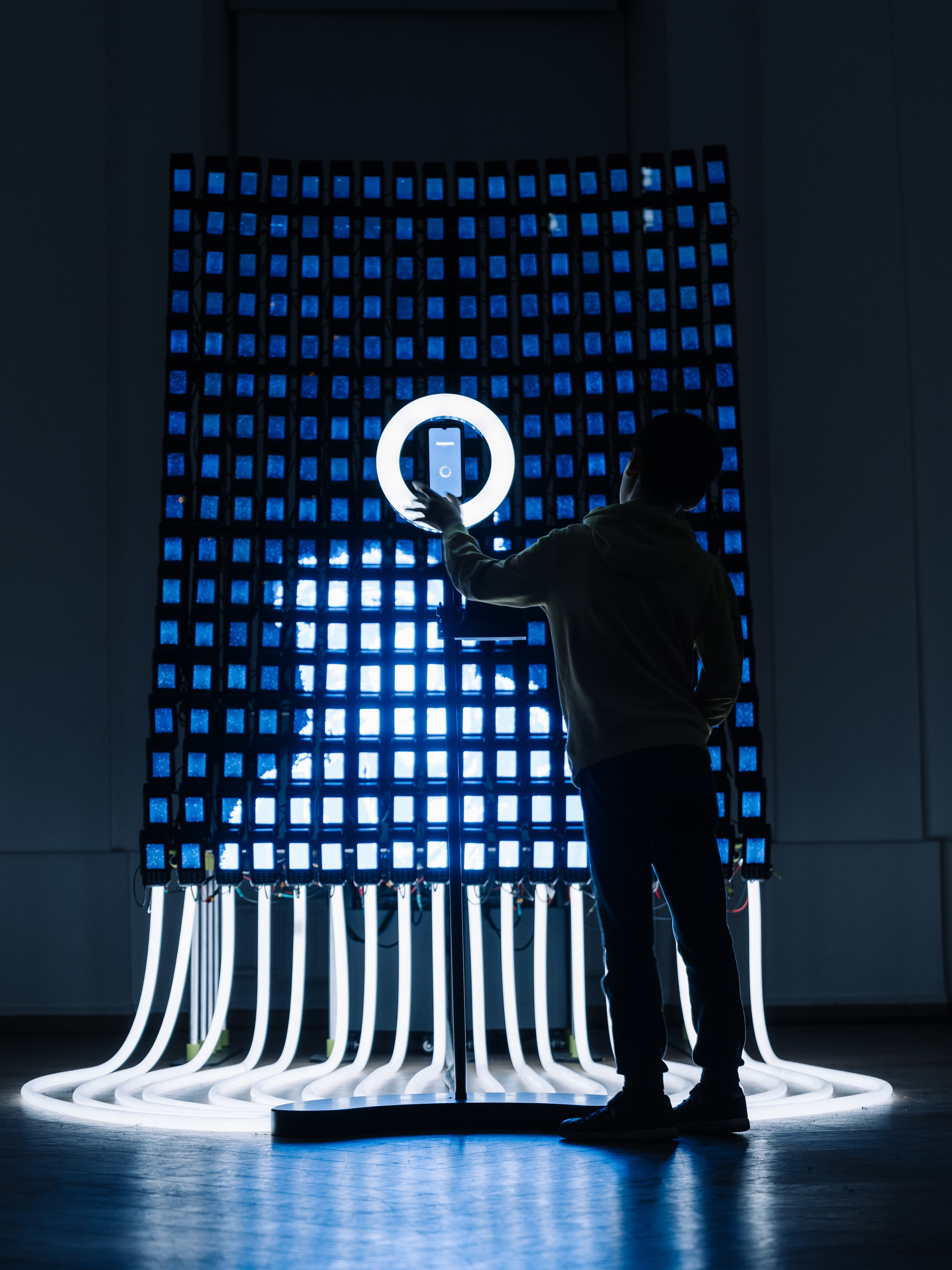 We synchronized all terminals into a real-time responsive system, ensuring stable data transmission and visual coherence across the entire wall from one new terminal. Face recognition was integrated as an activation trigger, linking user input with immediate system feedback. The installation balanced complex infrastructure with seamless interaction.