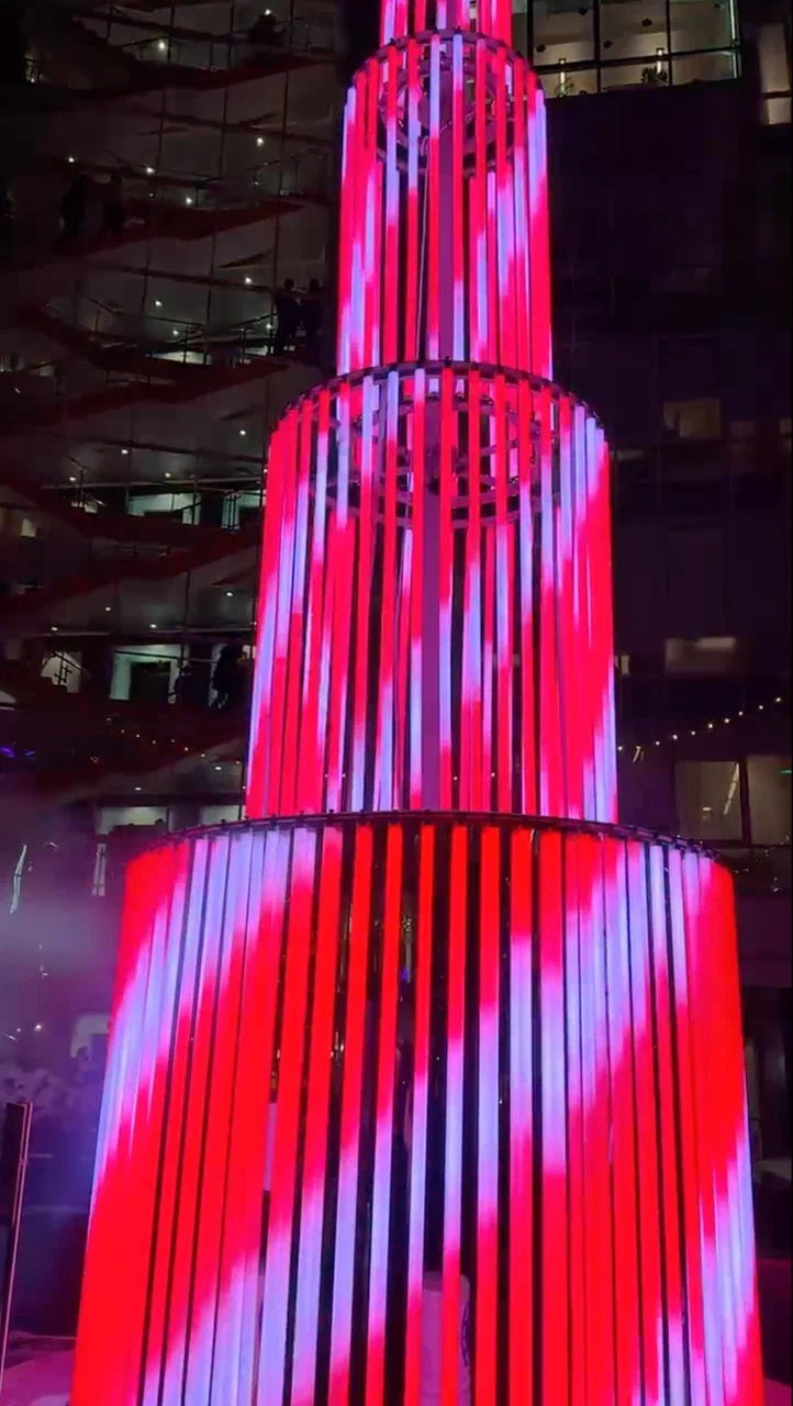 A next-generation Christmas tree — a volumetric construction of LED tubes instead of a traditional tree with ornaments. Concentric circles of LED elements create a recognizable silhouette that comes alive only through collective interaction. Each participant scans a QR code and lights tree segments with simple clicks. When all elements are filled with light, a dynamic show with a smoke machine launches, rewarding participants for their joint efforts.